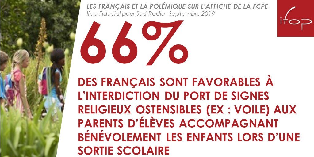 66% des Français sont favorables à l’interdiction du port de signes religieux ostensibles (ex : voile) aux parents d’élèves accompagnant bénévolement les enfants lors d’une sortie scolaire